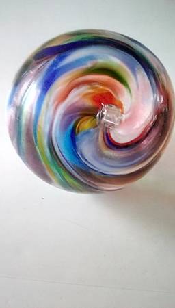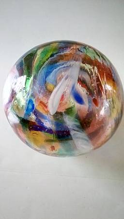 Item is thin glass with texture on the outside. I have never seen one quite this large before. It is approx. 8". Beautiful colors and in excellent shape. Used Sold as is. Pick up only