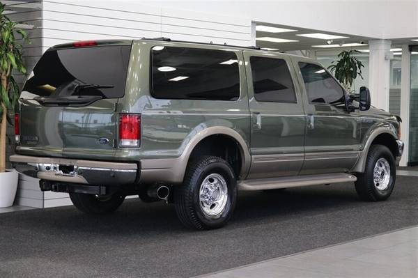 UP FOR GRABS IS A SUPER HARD TO FIND IN THIS SHAPE AND CONDITION AND SUPER LOW MILES LOCAL WEST COAST 2-OWNER SINCE NEW 2001 FORD EXCURSION LIMITED 4X4 WITH TURBO POWERSTROKE 7.3L AND ONLY 105K MILES, 4X4, LOADED WITH ALL OPTIONS FROM THE FACTORY INCLUDING TINTED WINDOWS, 2-TONE PAINT, RUNNING BOARDS, EXTENDABLE TOWING MIRRORS, REAR AIR, HEATED SEATS, REAR PARKING SENSORS, 8-PASSENGER SEATING, FOG LIGHTS, TOW PACKAGE AND MUCH MORE. NO SIGNS OR RECORDS OF ANY ACCIDENTS OR DAMAGES EVER, NO MAJOR DENTS OR SCRATCHES AT ALL, LIKE NEW INTERIOR FREE OF ANY RIPS OR TEARS OR ANY BROKEN PLASTICS AT ALL, SUPER CLEAN CARPET AND HEADLINER, UPGRADED BILLET FRONT GRILL, ALMOST BRAND NEW SET OF MICHLIN DEFENDER LTX 10-PLY TIRES ALL THE WAY AROUND, UPGRADED 4"EXHAUST, UPGRADED SHOCKS, UPGRADED RIFFRAFF CHARGE PIPES WITH BOOTS AND CLAMPS, VIPER ALARM WITH REMOTE START AND MUCH MORE. WE JUST DID A FULL FRESH SERVICE ON THIS EXCURSION INCLUDING NEW AIR FILTER / NEW HOOD SUPPORTS / NEW REAR BRAKE ROTORS - CALIPERS - PADS / BRAKE FLUID FLUSH / AC RECHARGE / NEW SERPANTINE BELT / NEW ALTERNATOR / COOLANT FLUSH / NEW REAR DOOR GLASS ACTUATOR AND MUCH MORE. THIS IS THE EXCURSION THAT YOU HAVE BEEN WAITING FOR SO HURRY AND BE THE LUCKY OWNER OF THIS RARE FIND.