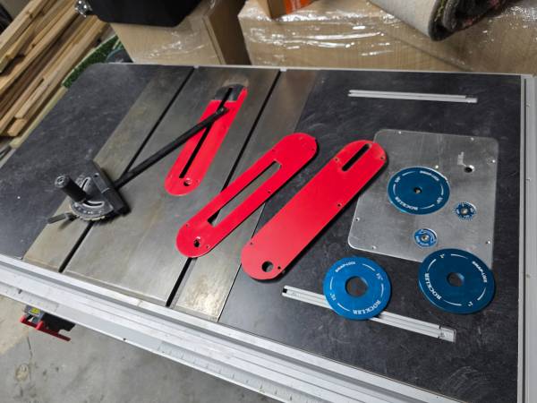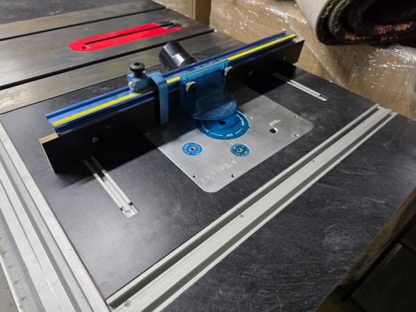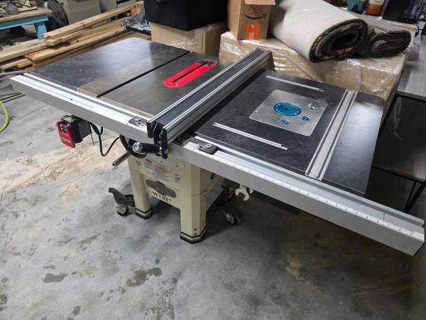 2 HP Shop fox 1837 table saw with custom built extension wings. The router table extension wing has a rockler sl router lift and a 3 1/4 HP Bora router built into it. It also has two dust ports, one 4 inch going to main extraction and a secondary port that goes up to the router fence (also included).